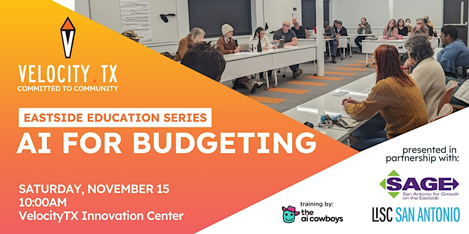 Join us Saturday, November 15 for our fourth and final workshop in the Eastside Education Series – AI For Budgeting. Learn how to use AI tools for budgeting, saving, and manageing your personal and work finances.