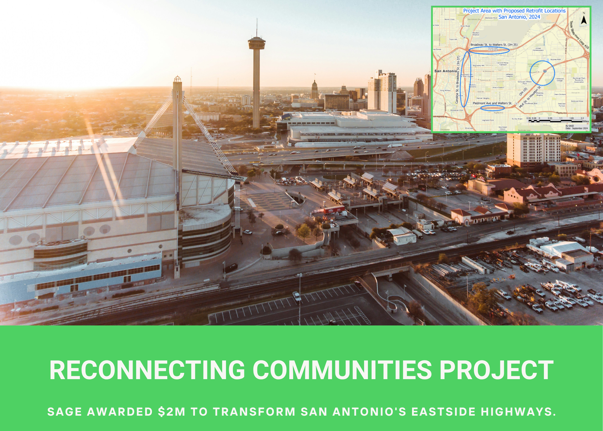 San Antonio for Growth on the Eastside, Inc. (SAGE) has been awarded a $2,000,000 USDOT Reconnecting Communities Project (RCP) planning grant to address longstanding barriers created by highways on San Antonio’s Eastside. The project focuses on developing a vision to cap, bury, and transform sections of IH-10, IH-35, and IH-37 into green, pedestrian-friendly spaces. This effort aims to reconnect historically divided neighborhoods, enhance mobility, and spur economic development.
